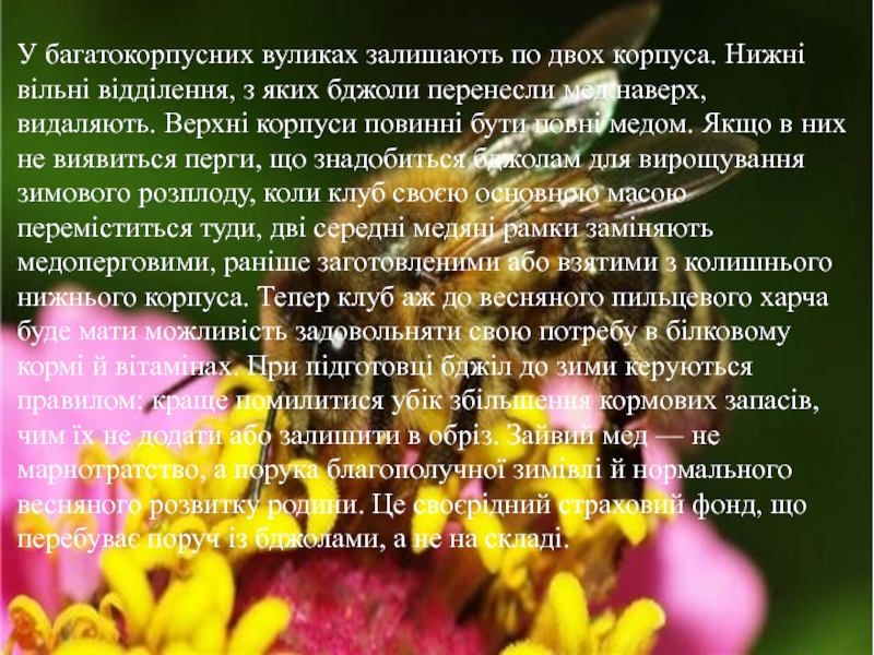 Слайд 8Бджоли готуються до зими .Залишився за основний медозбір — вінець