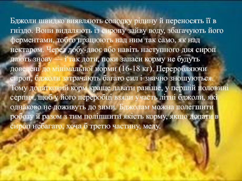 працюють над ним так само, як над нектаром. Через добу-двоє або навіть наступного дня сироп дають знову — і так доти, поки запаси корму не будуть доведені до мінімальної норми (16-18 кг). Переробляючи сироп, бджоли затрачають багато сил і значно зношуються. Тому додатковий корм краще давати раніше, у першій половині серпня, щоб у його переробці взяли участь літні бджоли, які однаково не доживуть до зими. Бджолам можна полегшити роботу й разом з тим поліпшити якість корму, якщо додати в сироп небагато, хоча б третю частину, меду.