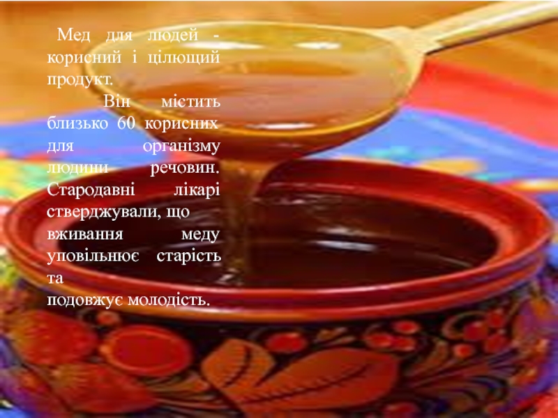 Слайд 7 Мед для людей - корисний і цілющий продукт.