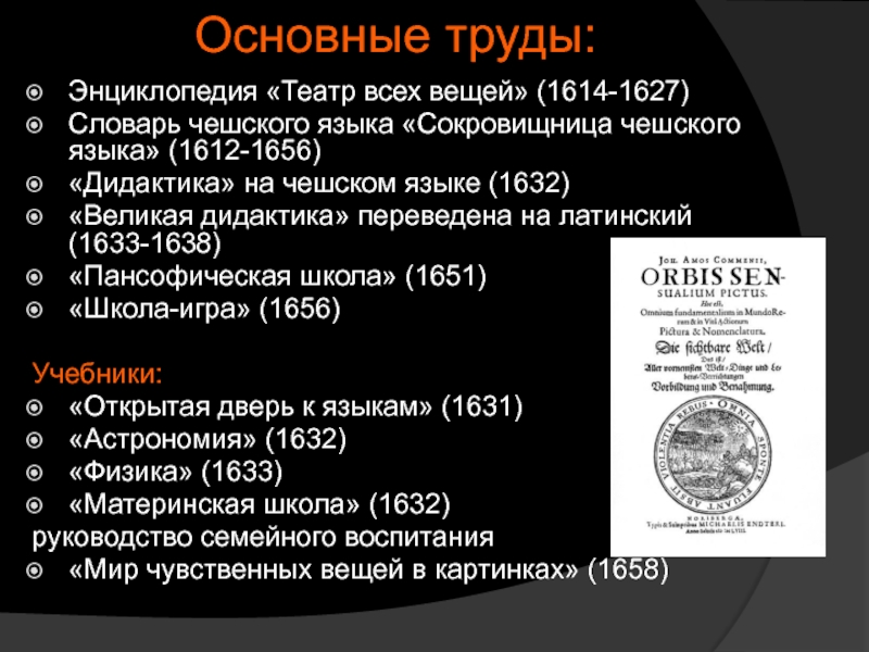 Слайд 13 В большинстве педагогических работ Коменского содержатся высказывания об