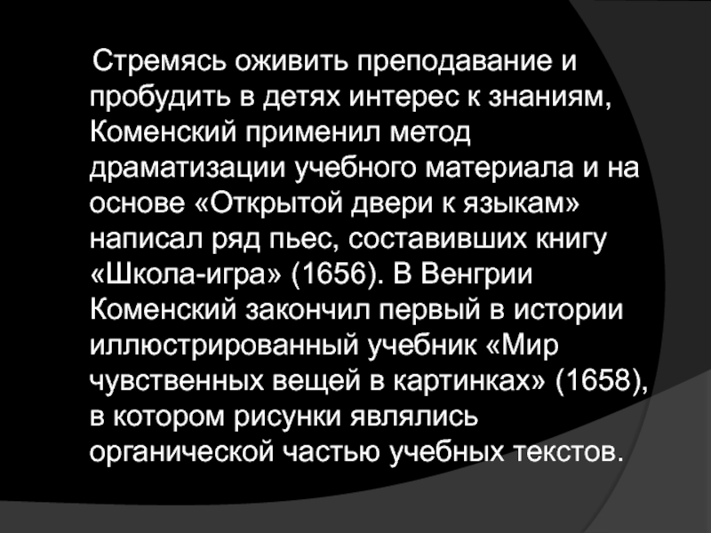 к знаниям, Коменский применил метод драматизации учебного материала и на