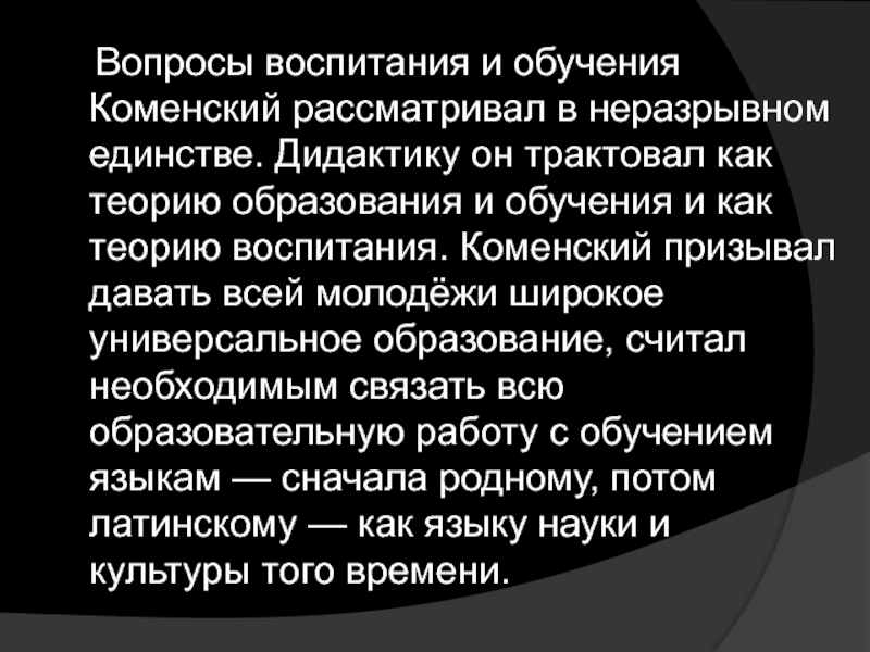 как теорию воспитания. Коменский призывал давать всей молодёжи широкое универсальное образование, считал необходимым связать всю образовательную работу с обучением языкам — сначала родному, потом латинскому — как языку науки и культуры того времени.
