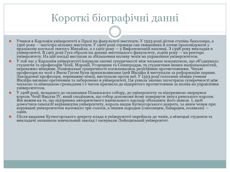 — магістра вільних мистецтв. У 1400 році отримав сан священика й почав проповідувати у празькому костьолі святого Михайла, а з 1402 року — у Вифлеємській каплиці. З 1398 року викладав в університеті. В 1401 році Гуса обрали на декана мистецького факультету, а1409 року — на ректора університету. На цій посаді виступав за збільшення впливу чехів на управління університетом.