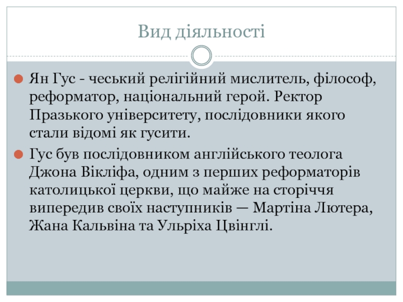 Слайд 2Ян Гус (народився приблизно 1369 Гусинець, Південна Чехія — помер