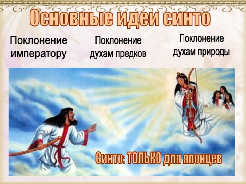 Основные идеи синтоПоклонениеимператоруПоклонениедухам предковПоклонениедухам природыСинто: ТОЛЬКО для японцев