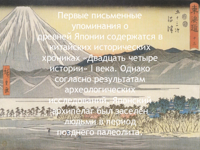 Слайд 2Первые письменные упоминания о древней Японии содержатся в китайских исторических хрониках «Двадцать