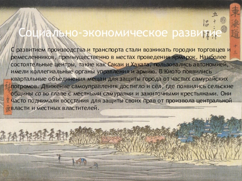 такие как Сакаи и Хаката, пользовались автономией, имели коллегиальные органы управления и армию. В Киото появились квартальные объединения мещан для защиты города от частых самурайских погромов. Движение самоуправления достигло и сёл, где появились сельские общины со во главе с местными самураями и зажиточными крестьянами. Они часто поднимали восстания для защиты своих прав от произвола центральной власти и местных властителей.