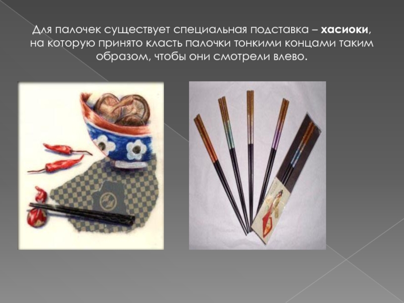 Слайд 14Для палочек существует специальная подставка – хасиоки, на которую принято