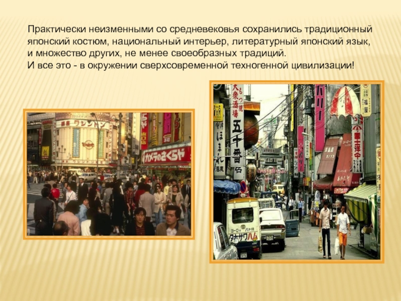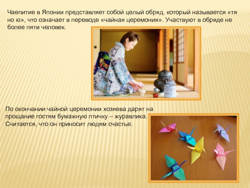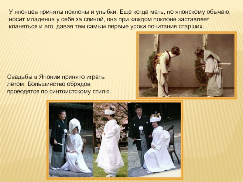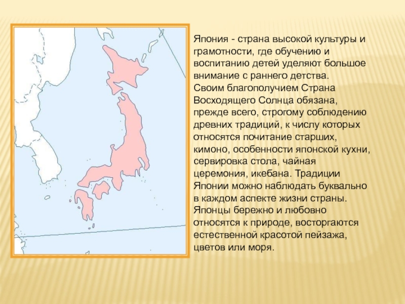 Восходящего Солнца обязана, прежде всего, строгому соблюдению древних традиций, к числу которых относятся почитание старших, кимоно, особенности японской кухни, сервировка стола, чайная церемония, икебана. Традиции Японии можно наблюдать буквально в каждом аспекте жизни страны.Японцы бережно и любовно относятся к природе, восторгаются естественной красотой пейзажа, цветов или моря.