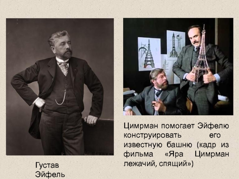 Густав ЭйфельЦимрман помогает Эйфелю конструировать его известную башню (кадр из фильма «Яра Цимрман лежачий, спящий»)