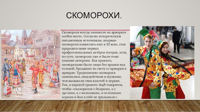 еще в XI веке, став прародителями первых профессиональных актёров театров, хотя, по сути, скоморохи уже и были теми самыми актерами. Как правило, скоморохами были люди без крыши над головой, бродящие по свету от ярмарки к ярмарке. Традиционно скоморохи занимались лицедейством и шутками, чем вызывали гнев властей и церкви. Так, в царской грамоте 1648 говорится, чтобы «скоморохов с домрами, и с гуслями, и с волынками, и со всякими играми в дом к себе не призывали».