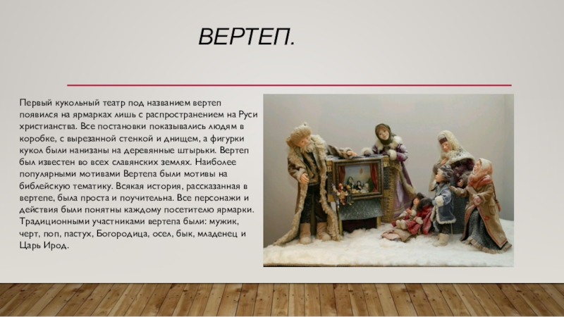 на Руси христианства. Все постановки показывались людям в коробке, с вырезанной стенкой и днищем, а фигурки кукол были нанизаны на деревянные штырьки. Вертеп был известен во всех славянских землях. Наиболее популярными мотивами Вертепа были мотивы на библейскую тематику. Всякая история, рассказанная в вертепе, была проста и поучительна. Все персонажи и действия были понятны каждому посетителю ярмарки. Традиционными участниками вертепа были: мужик, черт, поп, пастух, Богородица, осел, бык, младенец и Царь Ирод.
