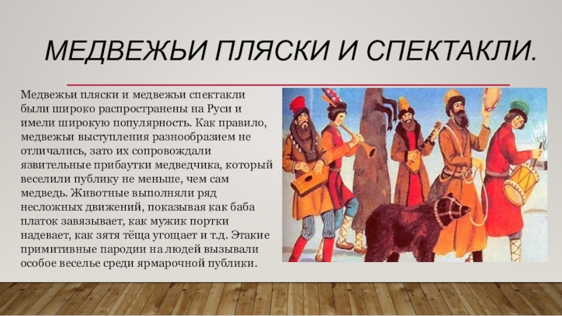 Слайд 5Медвежьи пляски и медвежьи спектакли были широко распространены на Руси