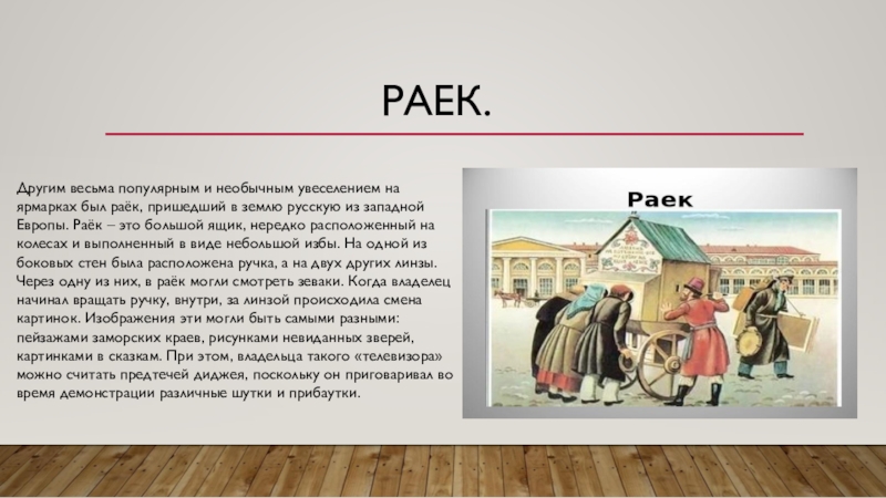 был раёк, пришедший в землю русскую из западной Европы. Раёк – это большой ящик, нередко расположенный на колесах и выполненный в виде небольшой избы. На одной из боковых стен была расположена ручка, а на двух других линзы. Через одну из них, в раёк могли смотреть зеваки. Когда владелец начинал вращать ручку, внутри, за линзой происходила смена картинок. Изображения эти могли быть самыми разными: пейзажами заморских краев, рисунками невиданных зверей, картинками в сказкам. При этом, владельца такого «телевизора» можно считать предтечей диджея, поскольку он приговаривал во время демонстрации различные шутки и прибаутки.