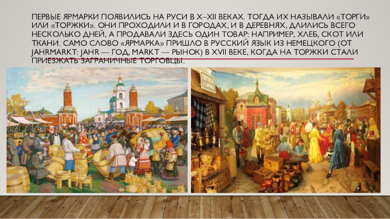 в деревнях, длились всего несколько дней, а продавали здесь один товар: например, хлеб, скот или ткани. Само слово «ярмарка» пришло в русский язык из немецкого (от Jahrmarkt: Jahr — год, markt — рынок) в XVII веке, когда на торжки стали приезжать заграничные торговцы.