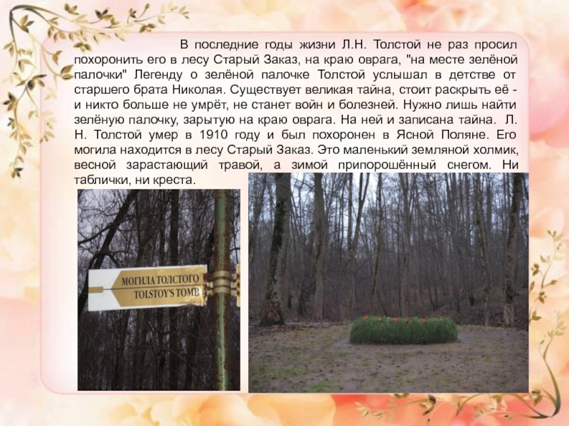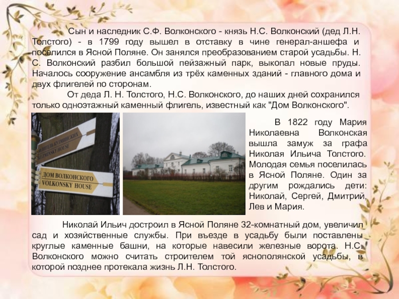 деятельности Льва Николаевича Толстого. Здесь, в имении своей матери, 28 августа 1828 года он родился. Здесь он прожил большую часть своей жизни. Первое упоминание о деревне Ясная Поляна встречается в архивных документах 1652 года.