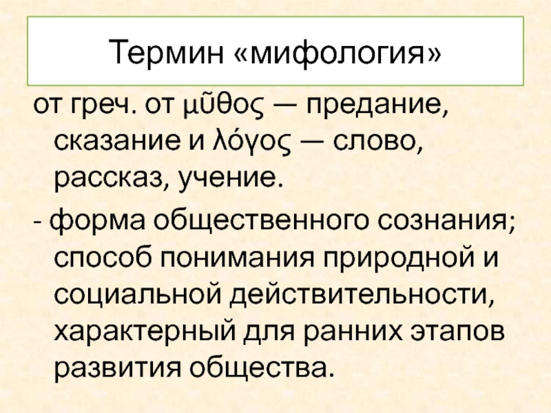 от греч. от μῦθος — предание, сказание и λόγος — слово, рассказ, учение.