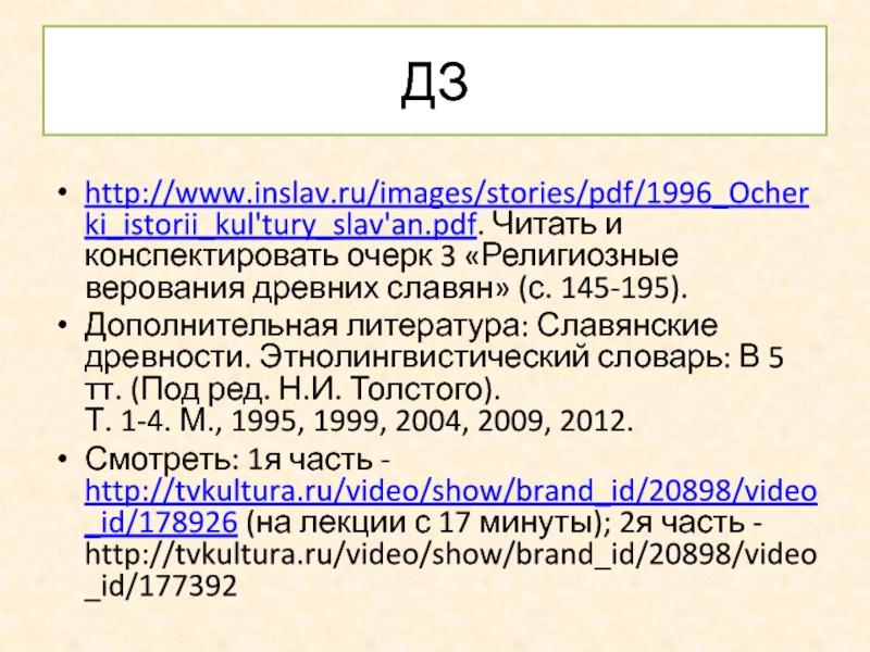 http://www.inslav.ru/images/stories/pdf/1996_Ocherki_istorii_kul'tury_slav'an.pdf. Читать и конспектировать очерк 3 «Религиозные верования древних славян»