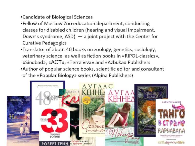 Translator of about 40 books on zoology, genetics, sociology, veterinary science, as well as fiction books in «RIPOL-classics», «Sindbad», «АСТ», «Terra viva» and «Azbuka» Publishers