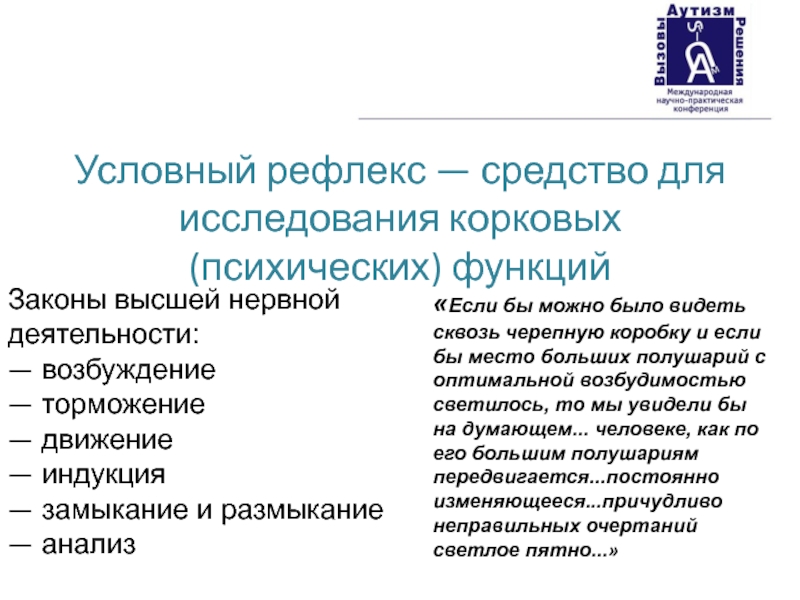 Слайд 13Условный рефлекс — средство для исследования корковых (психических) функций