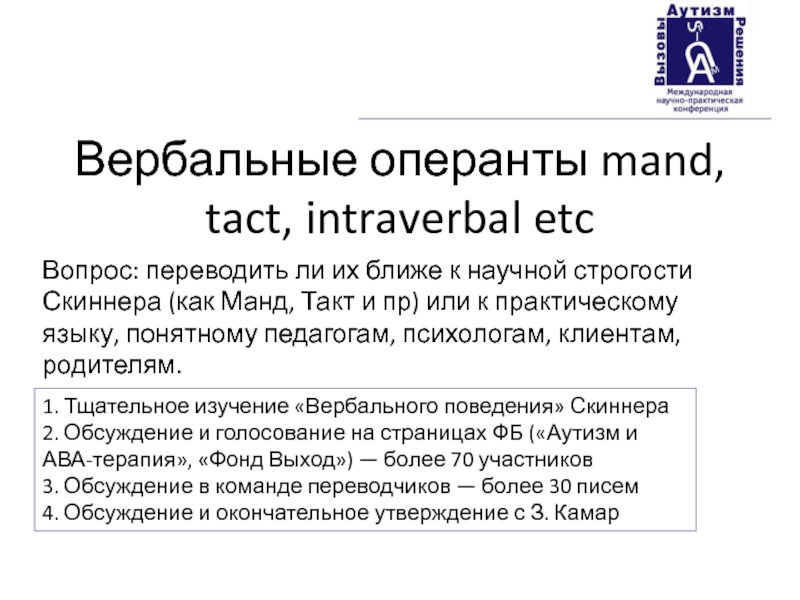 Слайд 29Вербальные операнты mand, tact, intraverbal etc