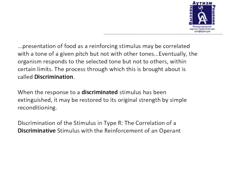 other tones...Eventually, the organism responds to the selected tone but not to others, within certain limits. The process through which this is brought about is called Discrimination.