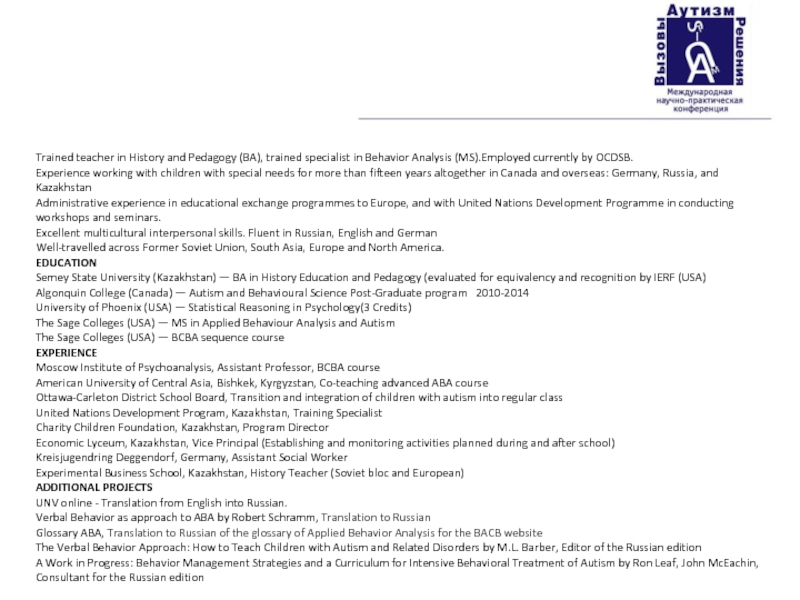 Moscow Institute of Psychoanalysis, Assistant Professor, BCBA course