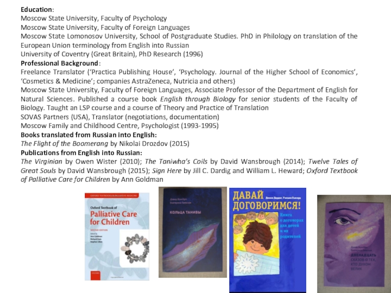 Moscow State University, Faculty of Foreign Languages, Associate Professor of the Department of English for Natural Sciences. Published a course book English through Biology for senior students of the Faculty of Biology. Taught an LSP course and a course of Theory and Practice of Translation