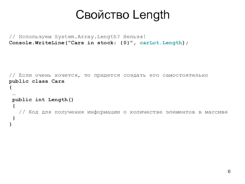 Console.WriteLine("Cars in stock: {0}", carLot.Length);
