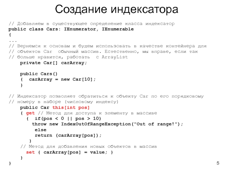 // Индексатор позволяет обратиться к объекту Car по его порядковому