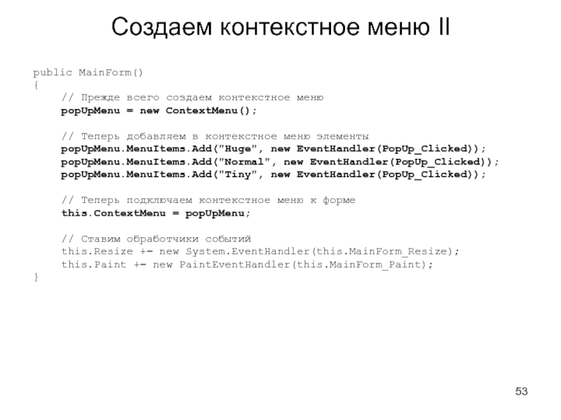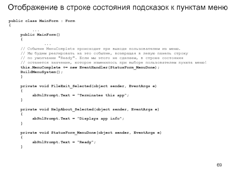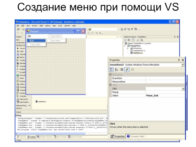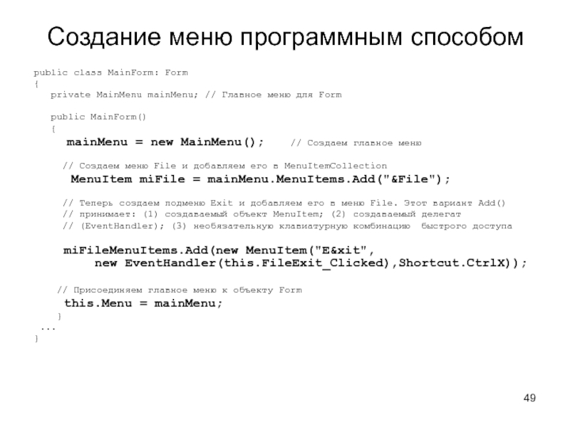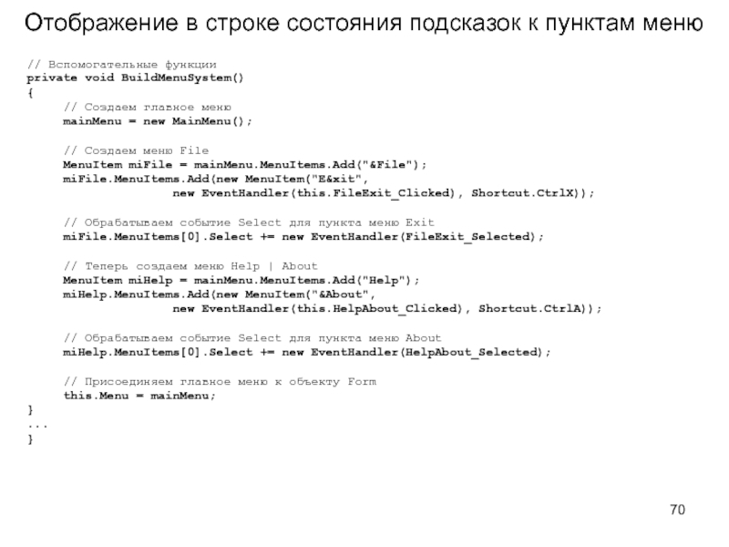 miFile.MenuItems[0].Select += new EventHandler(FileExit_Selected);