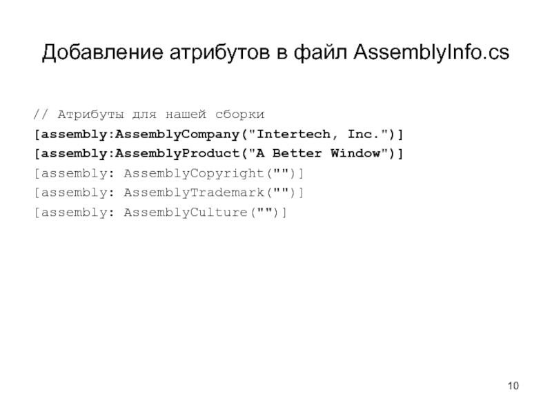 Слайд 10Добавление атрибутов в файл AssemblyInfo.cs