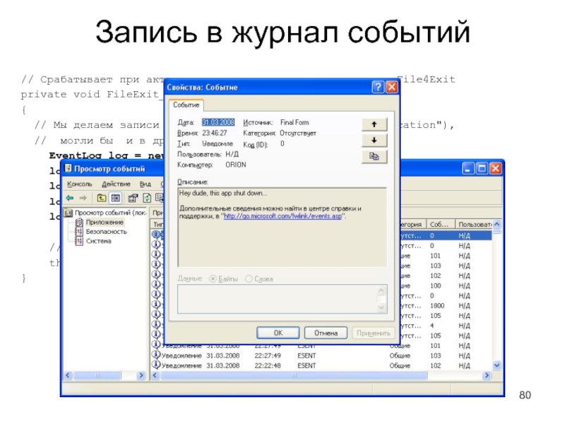 MessageBox.Show("Message: " + log.Entries[i].Message + "\n" + "Box name: "
