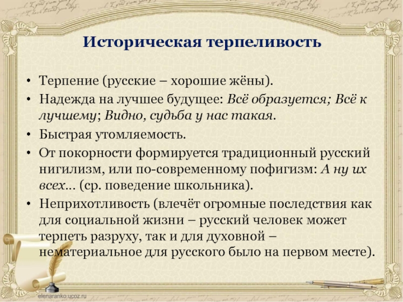Неприхотливость (влечёт огромные последствия как для социальной жизни – русский человек может терпеть разруху, так и для духовной – нематериальное для русского было на первом месте).