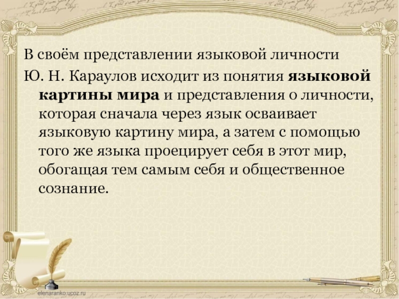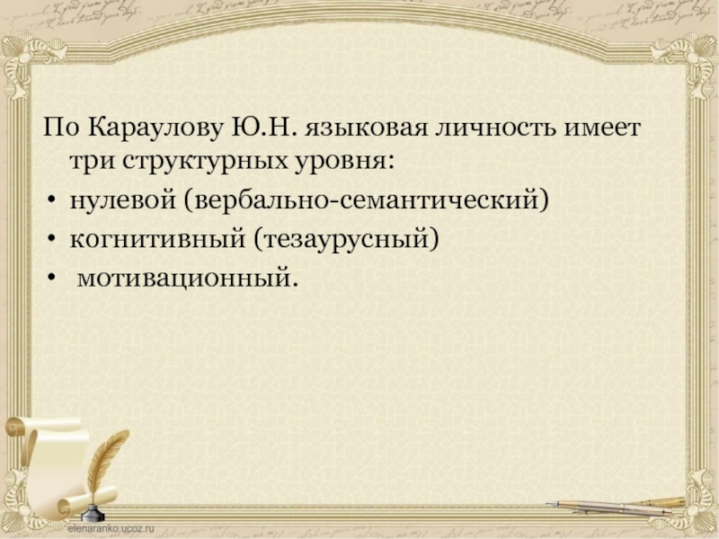 Слайд 6По Караулову Ю.Н. языковая личность имеет три структурных уровня: