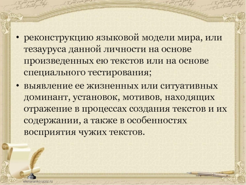 Слайд 11реконструкцию языковой модели мира, или тезауруса данной личности на основе