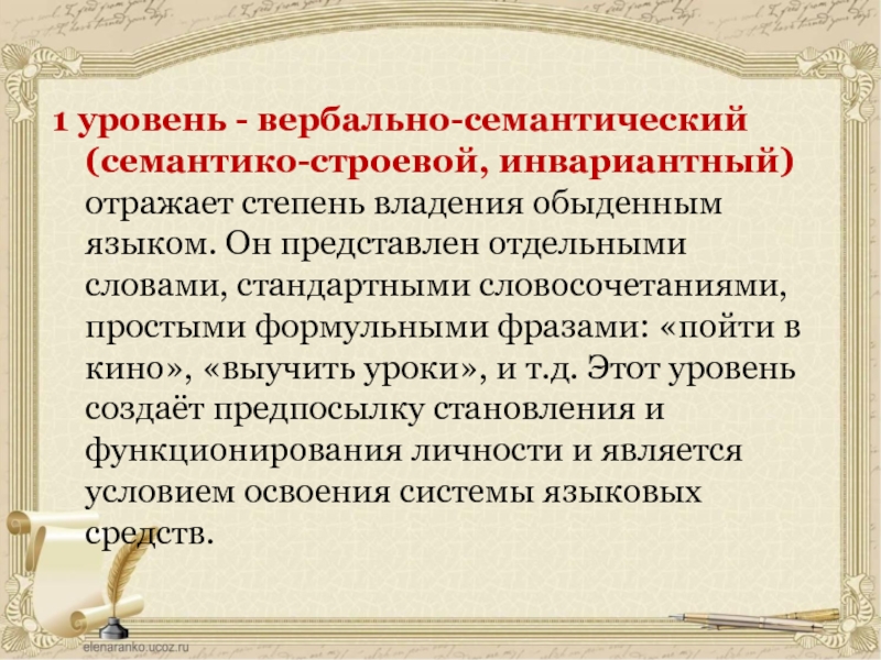 Слайд 71 уровень - вербально-семантический (семантико-строевой, инвариантный) отражает степень владения обыденным