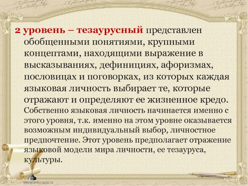 каждая языковая личность выбирает те, которые отражают и определяют ее жизненное кредо. Собственно языковая личность начинается именно с этого уровня, т.к. именно на этом уровне оказывается возможным индивидуальный выбор, личностное предпочтение. Этот уровень предполагает отражение языковой модели мира личности, ее тезауруса, культуры.