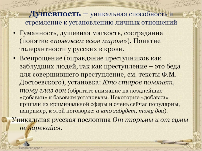 Всепрощение (оправдание преступников как заблудших людей, так как преступление – это беда для совершившего преступление, см. тексты Ф.М. Достоевского), установка: Кто старое помянет, тому глаз вон (обратите внимание на позднейшие «добавки» к базовым установкам. Некоторые «добавки» пришли из криминальной сферы и очень сейчас популярны, например, к этой поговорке: а кто забудет, тому два).