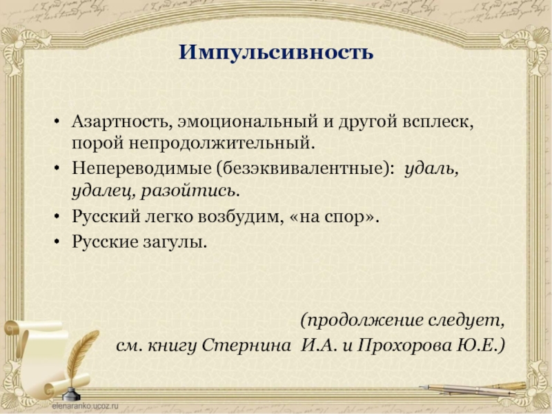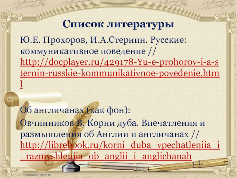 Ю.Е. Прохоров, И.А.Стернин. Русские: коммуникативное поведение // http://docplayer.ru/429178-Yu-e-prohorov-i-a-sternin-russkie-kommunikativnoe-povedenie.html