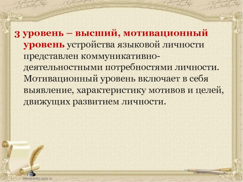 Слайд 93 уровень – высший, мотивационный уровень устройства языковой личности представлен