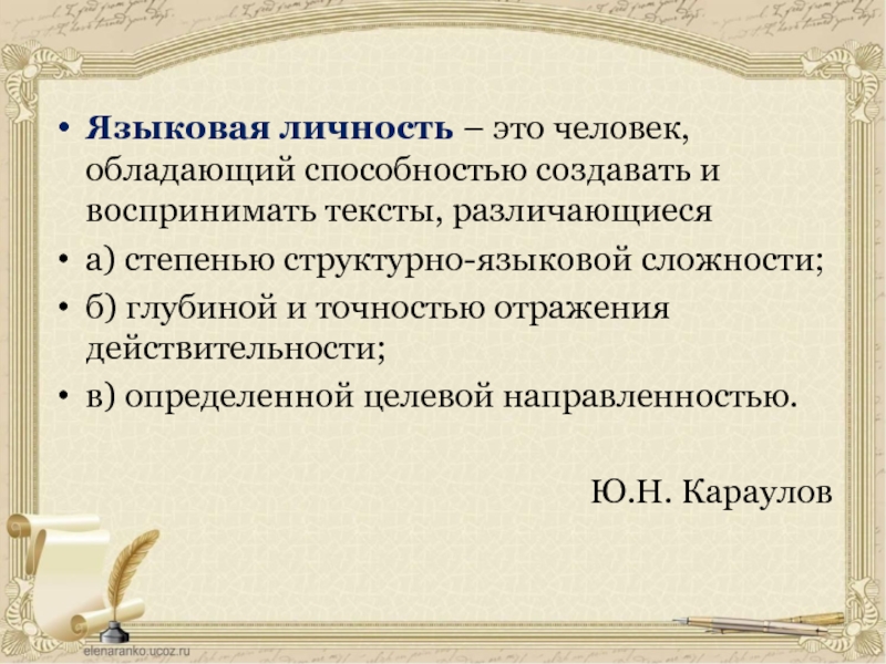 Слайд 4Языковая личность – это человек, обладающий способностью создавать и воспринимать