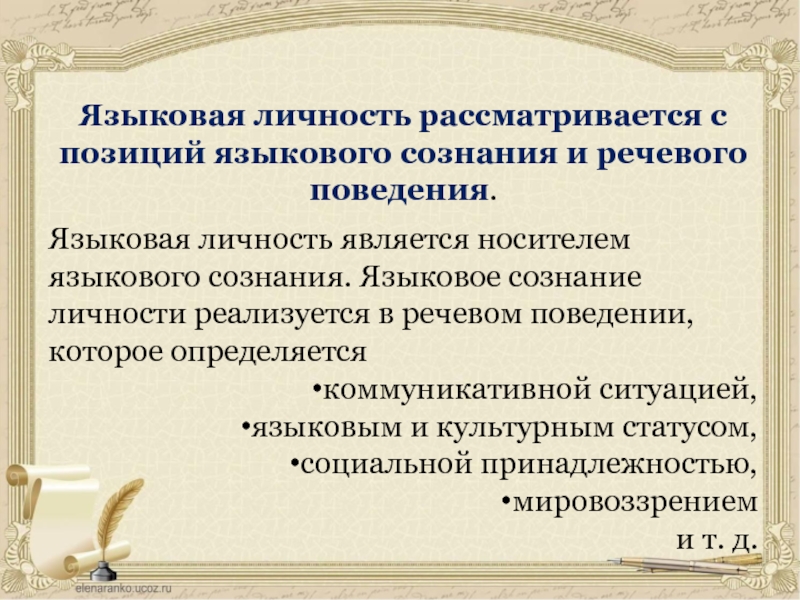 Слайд 12Языковая личность рассматривается с позиций языкового сознания и речевого поведения.