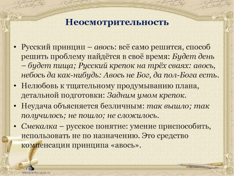 Смекалка – русское понятие: умение приспособить, использовать не по назначению. Это средство компенсации принципа «авось».