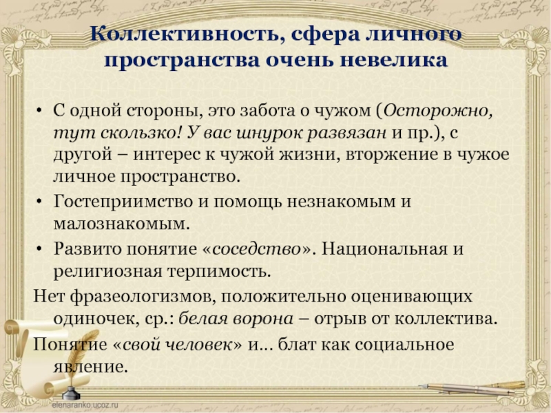 Слайд 14Коллективность, сфера личного пространства очень невелика