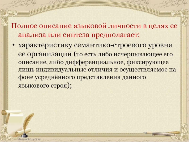 Слайд 10Полное описание языковой личности в целях ее анализа или синтеза