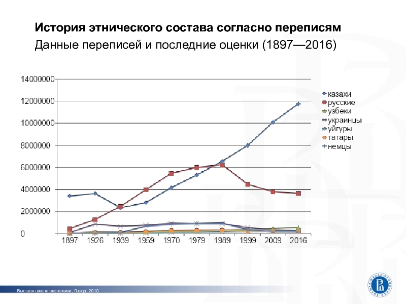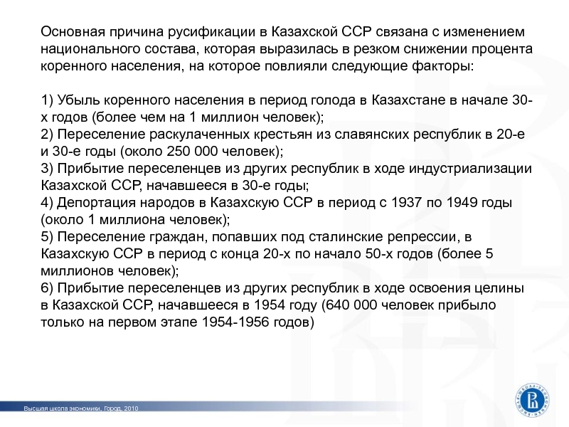 3) Прибытие переселенцев из других республик в ходе индустриализации Казахской ССР, начавшееся в 30-е годы;