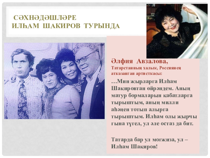 ,,Әдәбият-сәнгатьнең һәр өлкәсендә безнең йолдызларыбыз бар. Ә Илһам алар арасында да илаһи таланты белән балкып торган йолдызларның йолдызы.