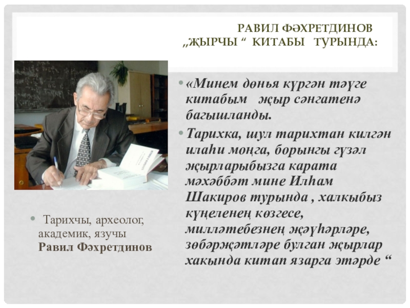 Тарихка, шул тарихтан килгән илаһи моңга, борынгы гүзәл җырларыбызга карата мәхәббәт мине Илһам Шакиров турында , халкыбыз күңеленең көзгесе, милләтебезнең җәүһәрләре, зөбәрҗәтләре булган җырлар хакында китап язарга этәрде “