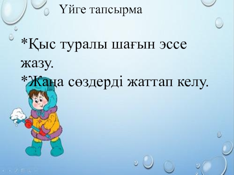 Үйге тапсырма*Қыс туралы шағын эссе жазу.*Жаңа сөздерді жаттап келу.